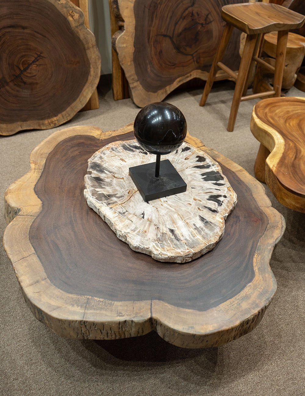 Hecho de madera petrificada originada a lo largo de millones de años conservando la forma y textura original de la madera, transformada en un material resistente y exclusivo.