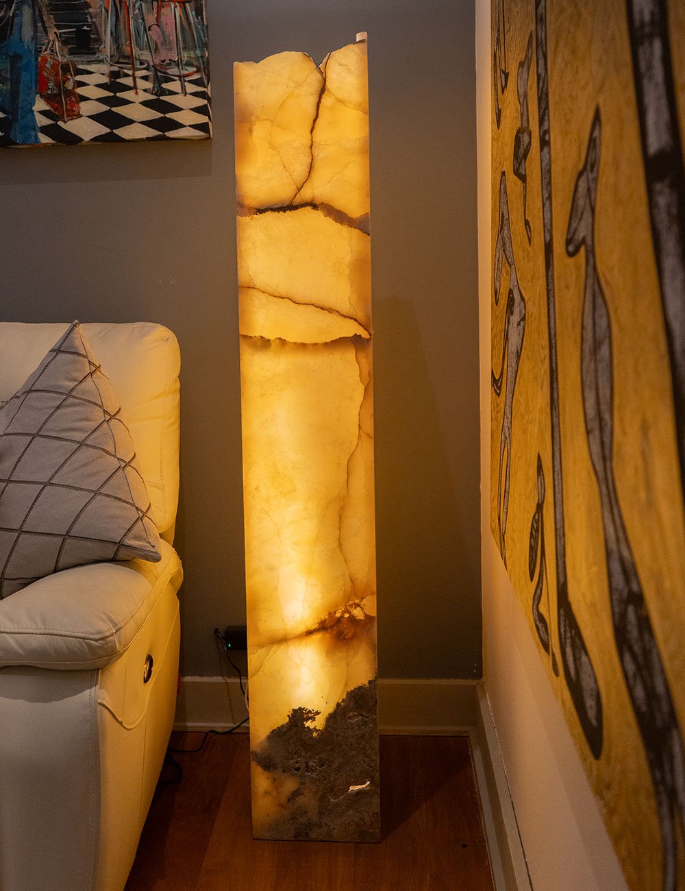 Una lámpara de piedra ónix emite una luz cálida y suave que resalta sus vetas naturales, creando un ambiente elegante y acogedor. Su diseño combina la belleza mineral con una iluminación sofisticada y artesanal.