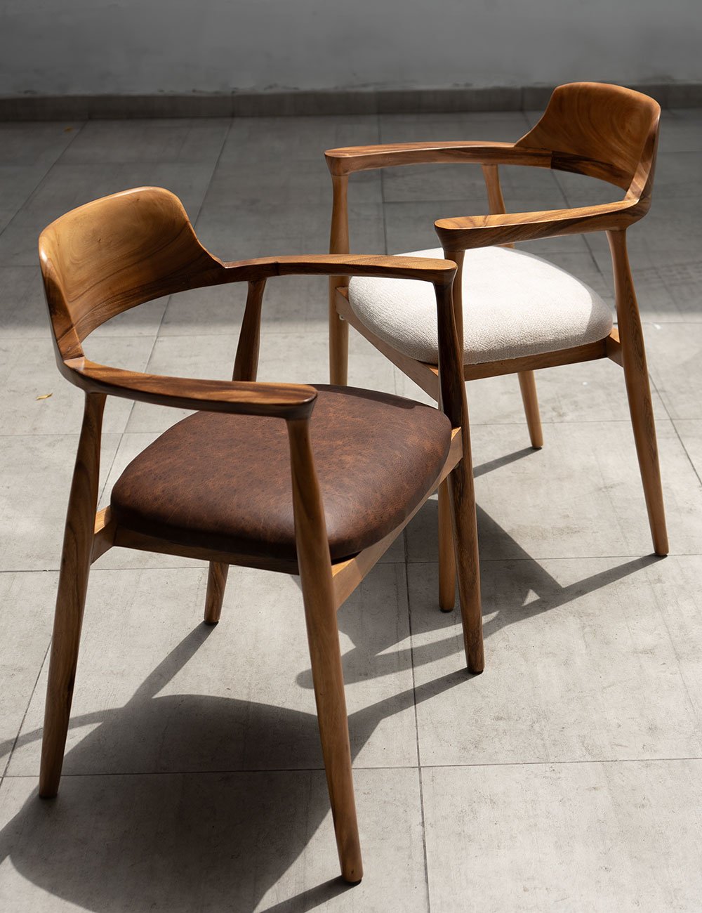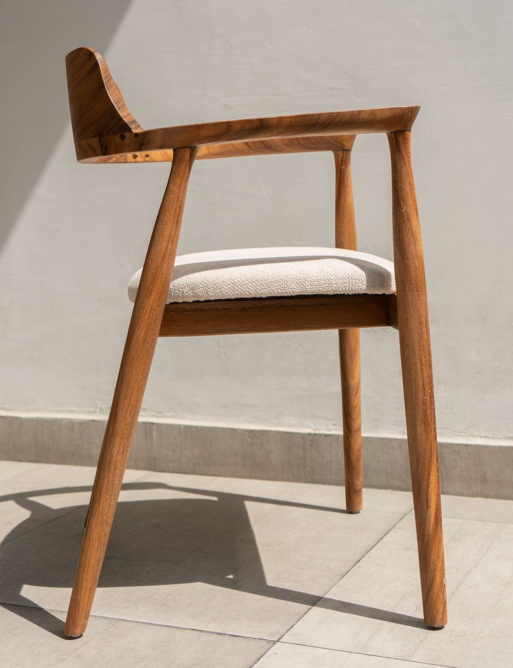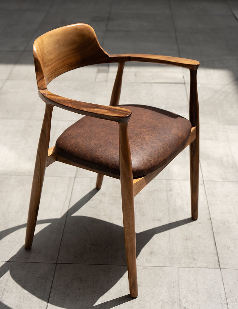 Fabricada con madera de raíz de alta calidad, esta silla combina líneas limpias con la calidez única de la veta natural.